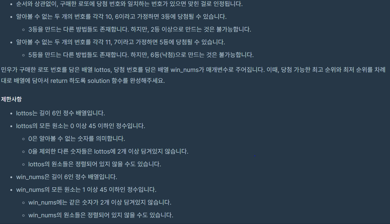 class Solution { public int[] solution(int[] lottos, int[] win_nums) { int[] answer = new int[2]; int max_cnt = 0; int min_cnt = 0; for(int i = 0; i <6; i++){ for(int j=0; j<6; j++){ if(lottos[i] == win_nums[j]){ min_cnt++; } } if(lottos[i]==0){ max_cnt++; } } max_cnt = max_cnt + min_cnt; min_cnt = 7-min_cnt; max_cnt = 7-max_cnt; if(min_cnt>5) { min_cnt = 6; } if(max_cnt>5) { max_cnt = 6; } answer[0] = max_cnt; answer[1] = min_cnt; return answer; } }++