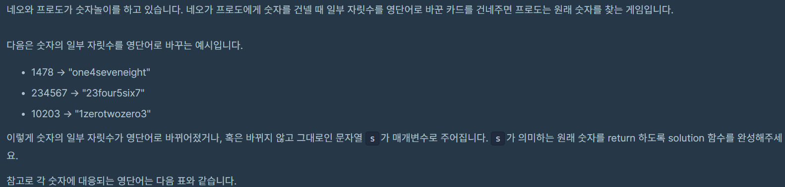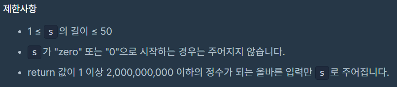 class Solution { public int solution(String s) { String[] eng = {"zero", "one", "two", "three", "four", "five", "six", "seven", "eight", "nine"}; String[] num = {"0","1","2","3","4","5","6","7","8","9"}; String tmp = s; for(int i = 0; i < eng.length; i++){ tmp = tmp.replace(eng[i],num[i]); } return Integer.parseInt(tmp); } }++