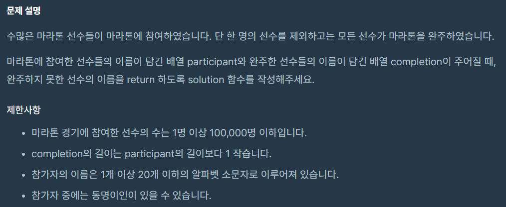 import java.util.Arrays; class Solution { public String solution(String[] participant, String[] completion) { String answer = ""; Arrays.sort(participant); Arrays.sort(completion); for(int i = 0; i < completion.length; i++) { if(!participant[i].equals(completion[i])){ answer = participant[i]; break; } if(i == completion.length-1){ answer = participant[i+1]; } } return answer; } }++
