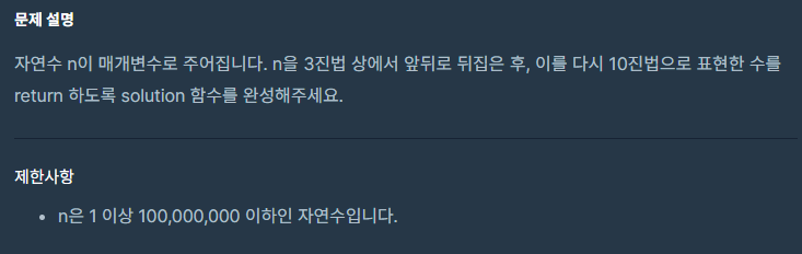 class Solution { public int solution(int n) { String ternary = ""; while(n > 0) { ternary = ternary + (n%3); n = n/3; } return Integer.parseInt(ternary,3); } }++