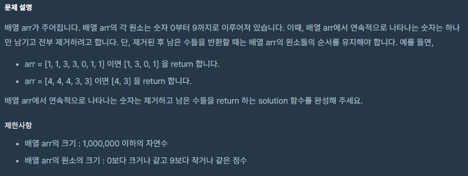 import java.util.*; public class Solution { public int[] solution(int []arr) { Stack<Integer> tmp = new Stack<>(); for(int i = 0; i < arr.length; i++){ if(!tmp.isEmpty() && tmp.peek() == arr[i]) continue; else tmp.push(arr[i]); } int[] answer = new int[tmp.size()]; for(int i = tmp.size()-1; i >= 0; i-- ){ answer[i] = tmp.pop(); } return answer; } }++