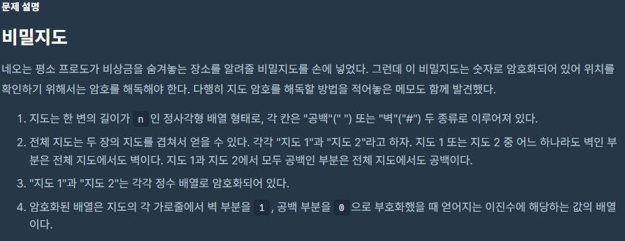 두 배열의 정수를 이진수로 변환하고 1은 # 0 은 공백으로 취급하여 지도를 반환해라.