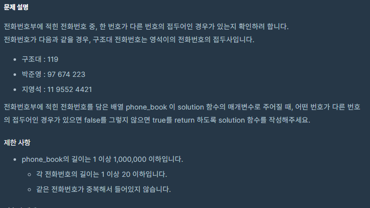 import java.util.*; class Solution { public boolean solution(String[] phone_book) { boolean answer = true; Arrays.sort(phone_book); for(int i = 0; i < phone_book.length - 1 ; i++){ String num1 = phone_book[i]; String num2 = phone_book[i+1]; if(num1.length() < num2.length() && num1.equals(num2.substring(0,num1.length()))){ return false; } } return answer; } }++