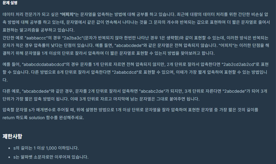 이렇게 압축을 할때 1개 이상 단위로 문자열을 잘라서 압축여 표현한 문자열중 가장 짧은 것의 길이를 반환.풀이