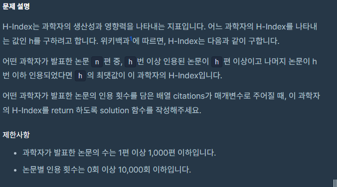 풀이는 처음으로 citations[i]의 값보다 큰 값들의 갯수가 citations[i]보다 커질때 값을 찾는 방식이었다.
