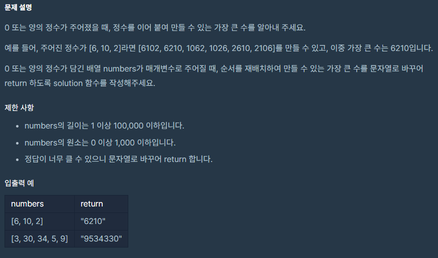 import java.util.*; class Solution { public String solution(int[] numbers) { String answer = ""; List<String> nums = new ArrayList<String>(); String num1, num2; for(int num : numbers){ nums.add(Integer.toString(num)); } Collections.sort(nums,Collections.reverseOrder()); for(int i = nums.size()-1; i > 0; i--){ num1 = nums.get(i); num2 = nums.get(i-1); if(num2.startsWith(num1) && num2.length() > num1.length()){ int n1 = Integer.parseInt(num1); int n2 = Integer.parseInt(num2.substring(1,num1.length()+1)); if(n1 > n2) { nums.set(i,num2); nums.set(i - 1, num1); } } } for(int i = 0; i < nums.size(); i++){ answer += nums.get(i); } if(answer.startsWith("0")) return "0"; return answer; } }++